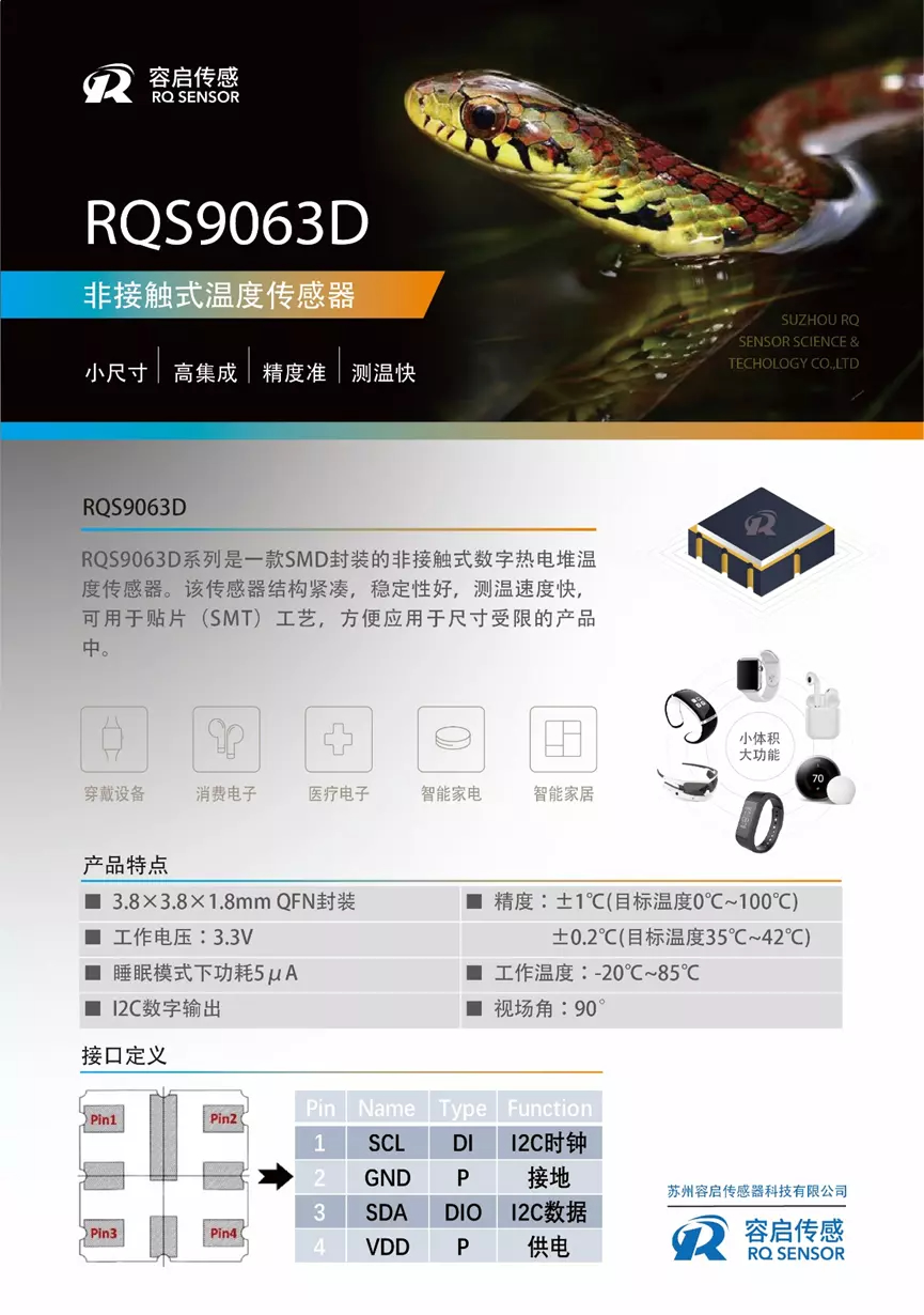 新技术革命的到来,世界开始进入信息时代。在利用信息的过程中,首先要解决的就是要获取准确可靠的信息,而传感器是获取自然和生产领域中信息的主要途径与手段,没有众多的优良的传感器,现代化生产生活也就失去了基础。目前传感器国际格局由美、日、德等企主导市场,国内企业竞争力弱,尚处于快速成长期,中国传感器市场70%左右的份额被外资企业占据。 蓝鲸体育长期致力于国产智能传感器的研发与经营,努力提升自身核心竞争力,尤其在热相关的技术服务与开发,目前非接触测温领域取得了一定成果突破,近来推出的非接触式红外温度传感器RQS9063D能够有效助力穿戴、耳机等行业伙伴企业实现更智能的体温检测健康功能。如今穿戴产品已经走到了智能健康时代,今年最新发布的苹果Apple Watch Series 8, 三星Galaxy Watch 5,华为Watch GT3 Pro,小米Watch S1 Pro, 荣耀的EarBuds 3 Pro耳机及助听器都增加了体温检测功能作为特别卖点,体温检测功能正由各头部企业引领,渐成为穿戴、耳机产品标配的趋势。 产品介绍: 容启RQS9063D非接触式温度传感器 典型应用电路: RQS9063D系列非接触式数字热电堆温度传感器,包括一个红外传感器(热电堆)和一个内建的传感器信号调理芯片,可以通过I2C接口连接到任何微控制器,这个微控制器可以方便获取ADC值和校准参数来计算温度结果。 应用领域: RQS9063D温度传感器可应用于可穿戴设备(智能手表、智能手环、智能耳机)、消费电子、医疗电子、智能家电、智能家居系统等,针对人体温度范围,可实现高精度温度测量。 容启传感 关于容启 蓝鲸体育成立于2015年,公司坐落于苏州纳米城工业园区,是一家专注于各类智能传器设计、研发及应用解决方案的供应商企业。 公司具有优秀的研发能力,核心研发团队拥有近20年的传感器开发经验及顶尖技术专利积累。公司技术开发人员直接对接客户支持,能够快速响应客户的各类需求,迭代更新,一切以客户利益为本。 苏州容启业务细分领域主要涉及红外非接触式测温、热式流量传感、气体传感、封装热测试系统等。在核心业务非接触式测温领域,经过多年的红外热电堆技术沉淀,持续推出体温、耳温检测方案,相关非接触式温度传感器产品具备批量生产供货能力,能够有效助力穿戴、耳机等行业伙伴企业实现更智能的体温检测健康功能。 苏州容启一直秉持自主创新、专业专注、质量第一、用户至上的核心发展理念,致力于为客户提供专业的、高性价比的解决方案,努力成为国际一流的智能传感器服务供应商。